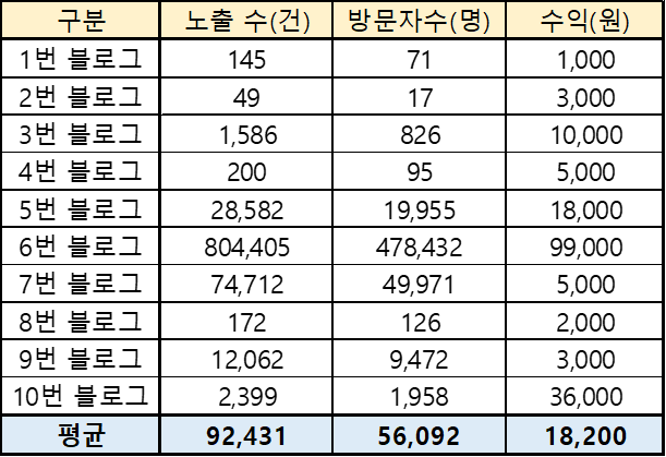 위의 표를 보면 알겠지만 노출수 (사람들에게 보여지는수), 방문자수 (노출된 보드를 보고 방문한 사람의 수) 는 수익에 크게 영향을 끼치지 않는듯하다. 단순하게 1번과 2번, 5번과 7번 블로그만 비교해도 그러하다.