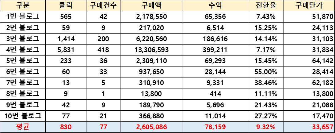 단가가 너무 낮은 제품을 공유하자니 수익이 안되고, 단가가 너무 높은 제품을 공유하면 구매가 이루어 지지 않을것으로 생각되어 조사한 수는 부족하지면 대략 3만원 수준의 제품을 공유하는게 좋을 듯 하다는것이 이 표를통하여 알아볼 수 있는 내용이었습니다.