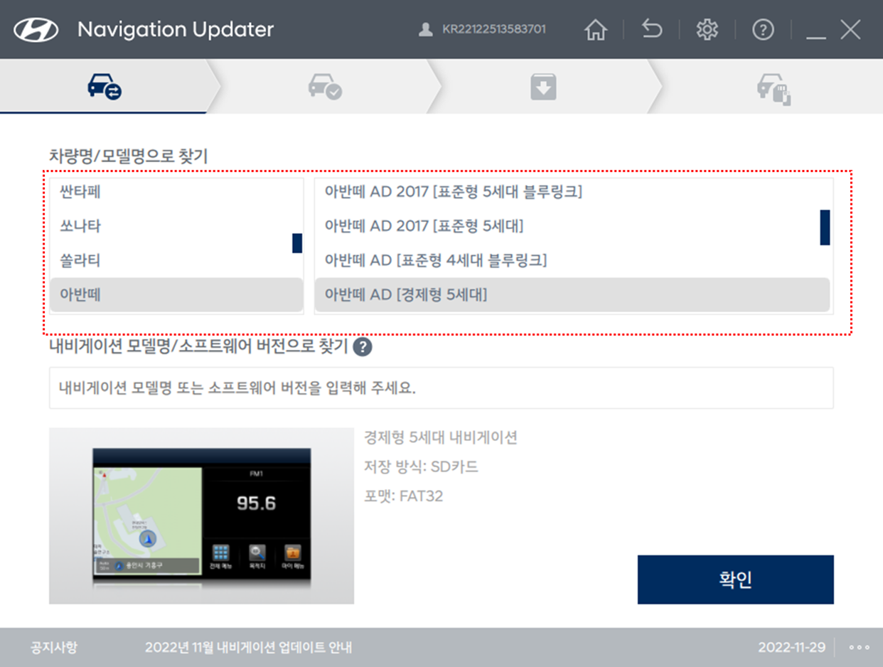 - 다음은 내 차량 내비게이션 모델 선택입니다. 우측 붉은 박스에서 차량을 선택합니다.