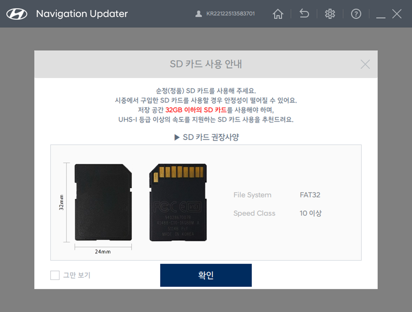 - 그러고나서 다음을 누르면 이런 안내메세지가 뜨게되는데 순정(정품)을 사용하라는 메세지이므로 읽고 확인을 누릅니다.