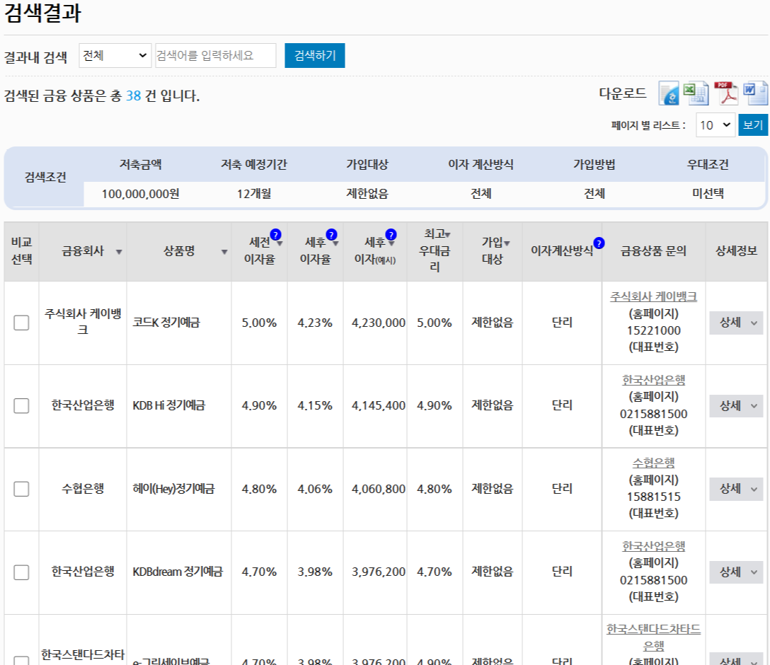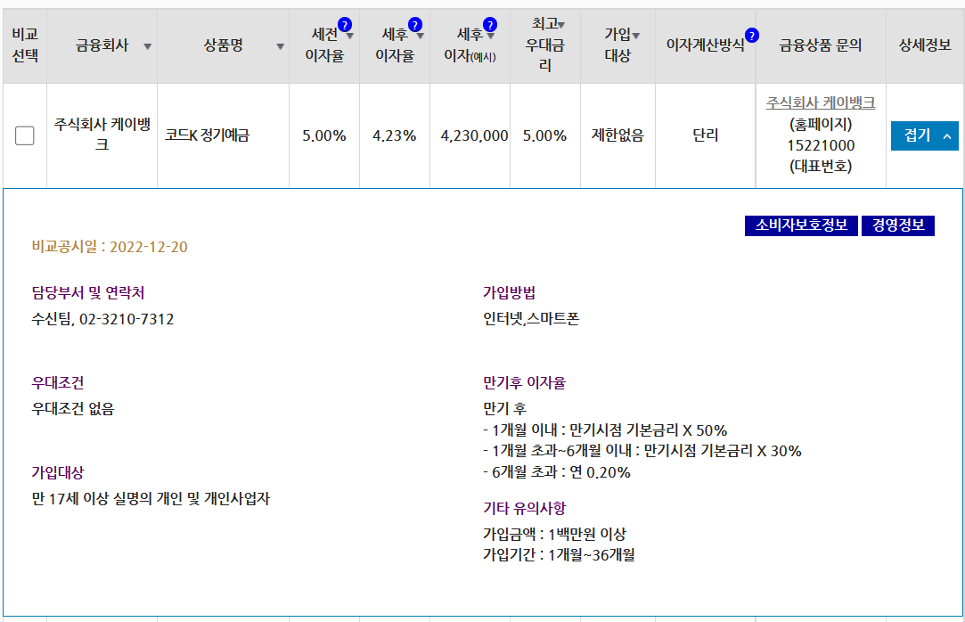 현재 표 상에서는 K뱅크의 '코드 K 정기예금'이 가장 금리가 좋은 것으로 검색이 되었습니다.