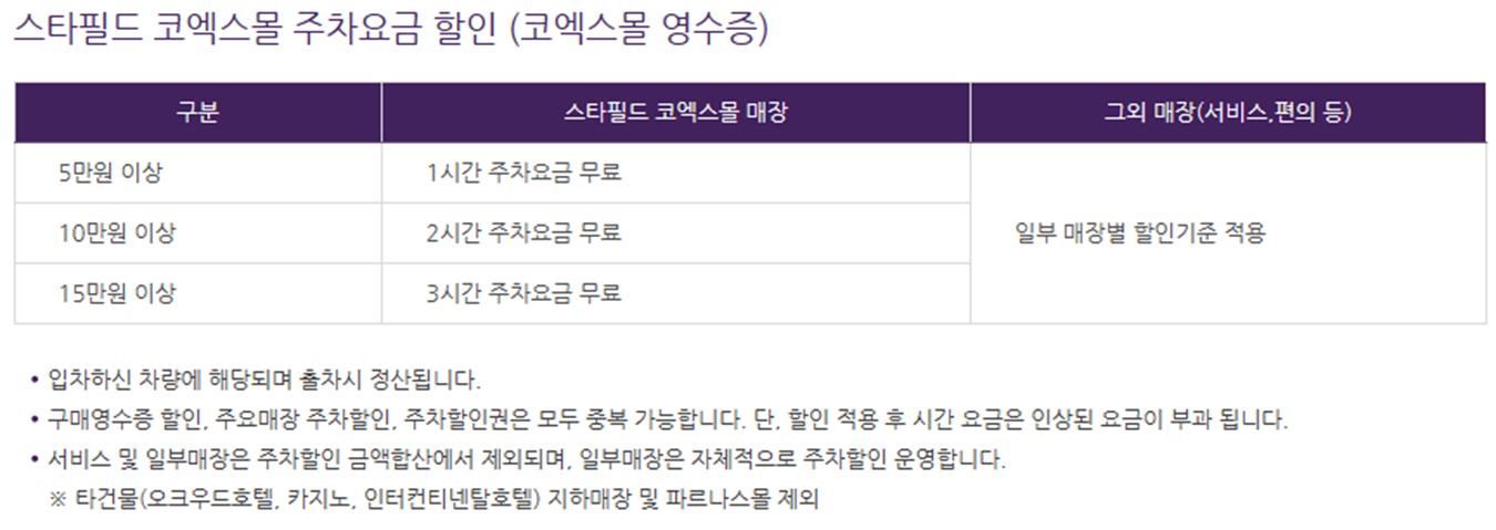 스타필드 코엑스몰을 이용하여 영수증이 있을경우 5만원당 1시간의 주차요금 할인이 되니 참고하시면 되겠습니다.
