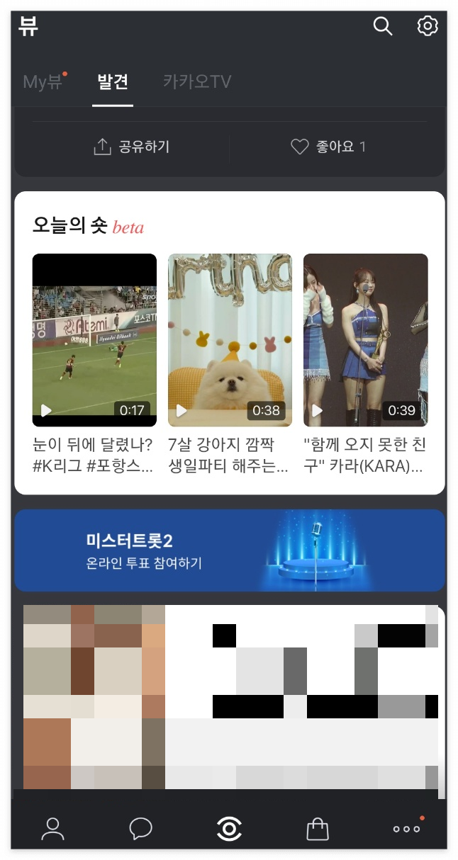 눌러서 들어가보니 카카오tv나 유튜브의 동영상들로 링크가 되어있음을 확인할 수 있었습니다. 카카오뷰탭 위치에 카카오tv를 연동한 쇼츠 플랫폼이 자리하려는지 그 부분도 주의 깊게 보도록 해야겠습니다. 저기서 또 다른 수익모델이 발생할지도 모르겠네요.