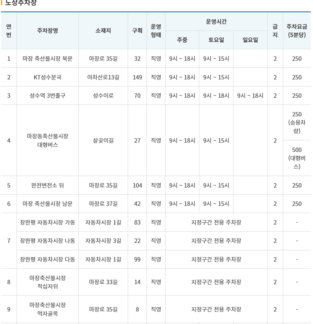 | 마장동 축산물시장 남문 노상공영주차장 | 평일 09:00 ~ 18:00 토요일 09:00 ~ 15:00 |